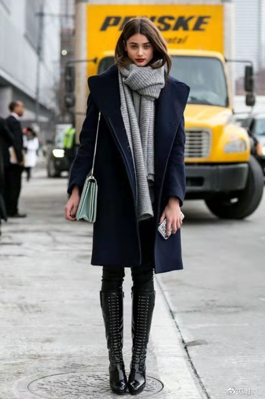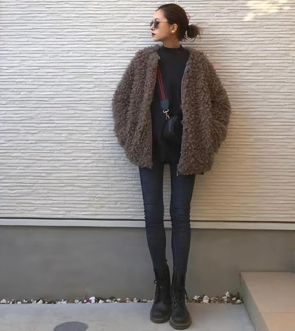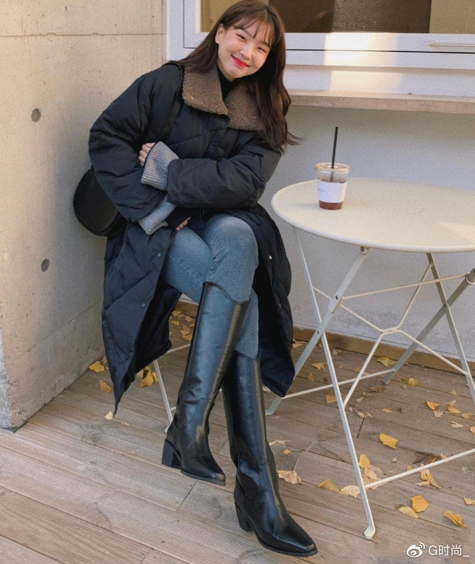 配搭皮毛一体的外套和中筒靴
