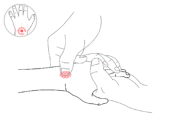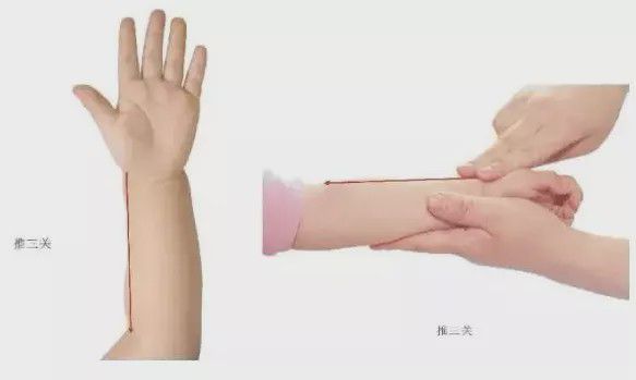 操作:家长用拇指在孩子手腕背侧、腕横纹中央凹陷处按揉。